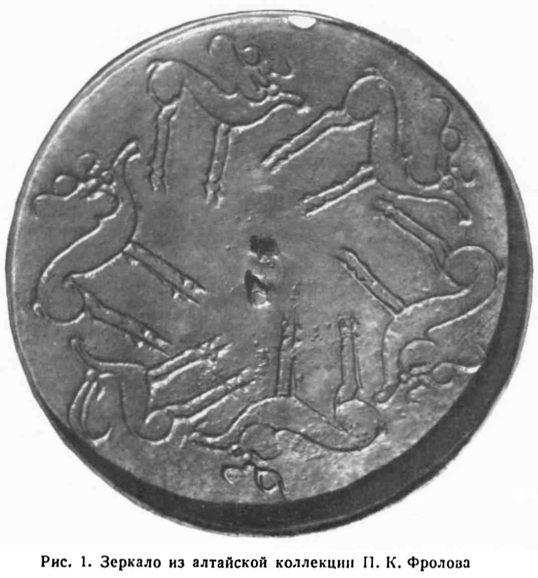 Отголосок этой картины мира усматривается в особенностях формы «скифских зеркал» VIII-VI вв. до н.э., имеющих по краю оборотной стороны непрерывный бортик, а в центре — ручку-петельку или 1-4 столбика, прикрытых круглой бляшкой-кнопкой, на которой изображены розетка, «лучи», свернувшийся хищник или горный козёл. Особую близость к иранскому «образу мира» обнаруживает древнейшее и наиболее насыщенное изображениями зеркало из Усть-Бухтармы (Алтай) [см. фото: Марсадолов 1982, Рис. 1], где вокруг центральной ручки изображены шесть животных (пять оленей и один козёл), возможно, соответствующих шести каршварам, из коих пять населены саками: само название saka восходит к именованию оленя-самца (Абаев, 1979).