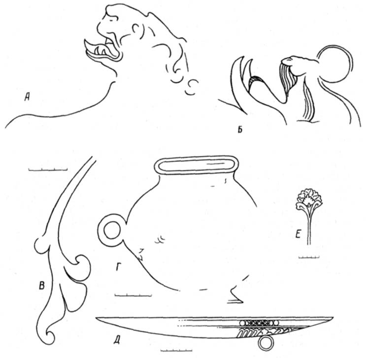 А) лев (цитадель); Б) крылатый верблюд (объект XVII); В) пальметта; Г) кружка; Д) блюдо; Е) опахало (В-Е — объект XXIV).