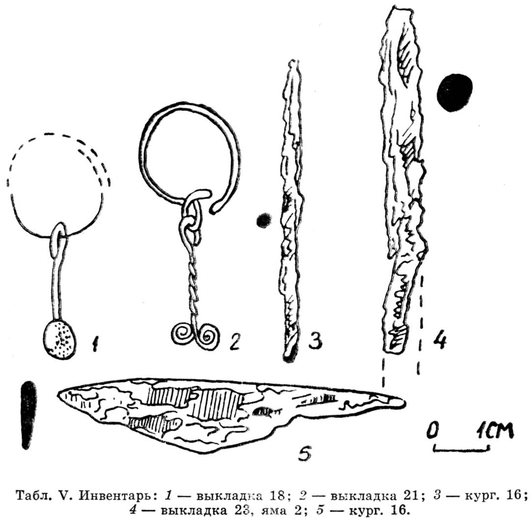 Курган 16 диаметром 6 м, насыпь каменная. В центре кургана — воронка длиной 2 м, шириной — 1,5 м и глубиной 0,3 м. На глубине 0,25 м от поверхности обнаружен завал из камней, который являлся перекрытием могильной ямы, по-видимому, потревоженной грабителями. Под камнями оконтурилась могильная яма, стенки которой обставлены каменными плитами или камнями, дно грунтовое. В северной части сохранилось перекрытие из положенных поперёк каменных плит. Высота ящика 0,35 м, длина 2 м, ширина 0,5 м (рис. 3, 1, 2). На дне ящика находился скелет человека в вытянутом положении, на спине, головой на ЮЮВ. Руки лежали вдоль туловища (рис. 3, 3). При расчистке скелета на тазовых костях, с левой стороны, в области пояса, найден железный ножичек с вычлененной рукояткой (табл. V, 5), в области грудных позвонков — четырёхгранное железное шило (табл. V, 3). В ногах стоял глиняный кувшин с шаровидным туловом, плоскодонный (рис. 4, 2), изготовленный ручной лепкой. В верхней части тулова — круглые отверстия для починки сосуда. Около локтевого су-