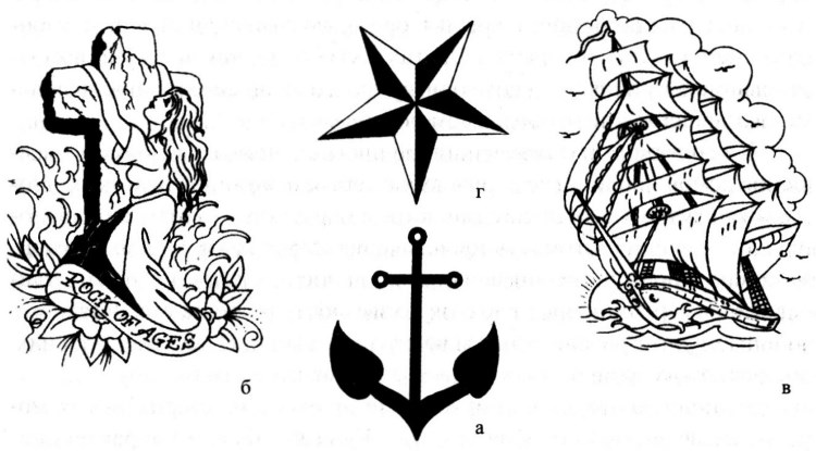 Рис. 5.1. Татуировки, принятые у американских моряков (составлено по данным Green, 2003): а) морской крест, б) «Скала времён», в) парусник, г) морская звезда.