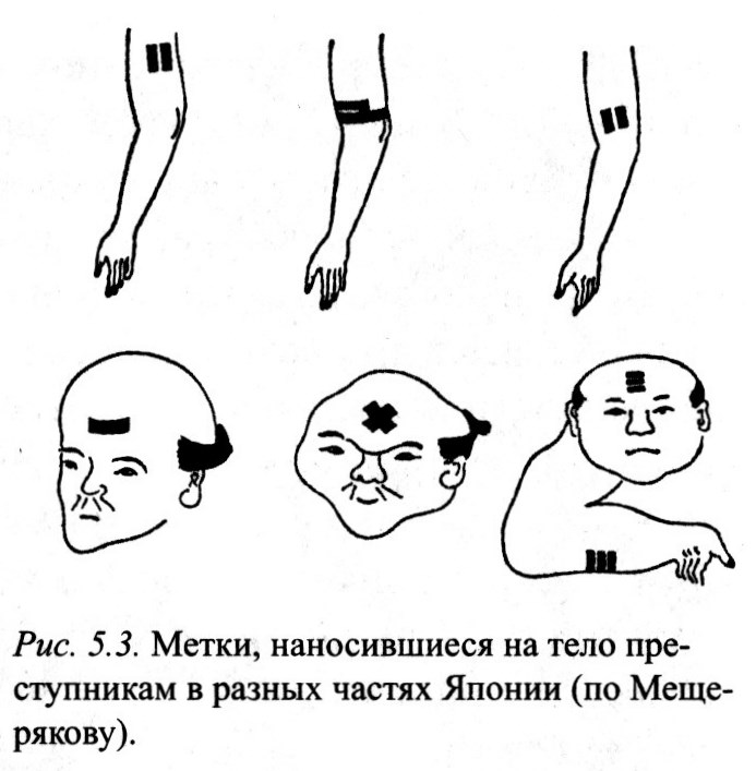 Рис. 5.3. Метки, наносившиеся на тело преступникам в разных частях Японии (по Мещерякову).