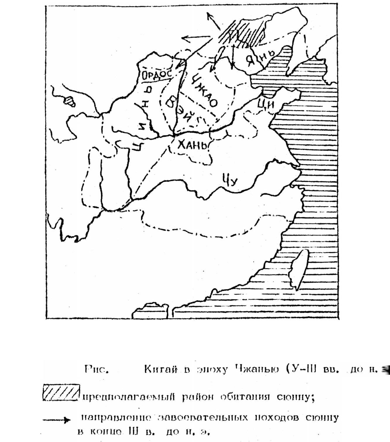 северу от границ этих бывших княжеств эпохи Чжаньго (северные районы современной провинции Хэбэй и западные районы современной провинции Ляонин). На этот же регион косвенно указывает и другая фраза из «Сюннулечжуань», где назван район обитания высшей сюннуской знати — «напротив Шангу, [...], имея на востоке границу с вэймо-Чаосянь». Добавим, что традиционная версия, размещающая сюнну эпохи Чжаньго в Ордосе, противоречит сведениям 100 главы о дунху как восточных соседях сюнну. Племена, известные под этим собирательным наименованием (которое и возникло, по сообщению позднеханьского комментатора Фу Цяня, для обозначения восточных соседей сюнну), занимали территорию современного Ляонина и прилегающие к нему районы и не могли иметь общую границу с Ордосом.