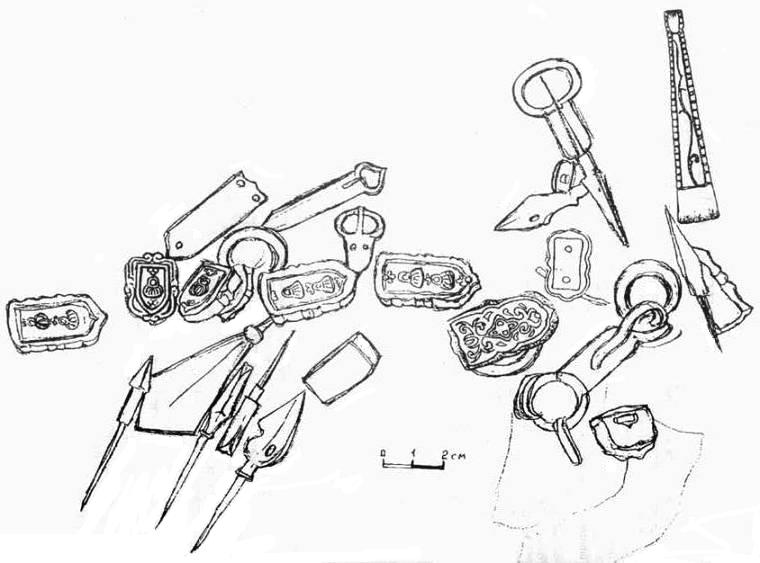 Сбруйный набор. (рис. 15) Все предметы сбруйного набора отлиты из бронзы, прикреплялись к ремням при помощи шпеньков, не выходящих на поверхность. На некоторых из них сохранились железные «основы» в виде узких полос или повторяющих, в основных чертах, форму изделия пластин. Набор включает 6 больших и 8 малых орнаментированных блях (рис. 15 — 2, 5, 6); малую бляху с рифлёными краями и гладкой поверхностью (рис. 15 — 4); большую, с выпуклой, как у орнаментированных, частью поверхности; 4 бляхи с прорезями в нижней части, форма их близка к трапециевидной, поверхность гладкая (рис. 15 — 1); и бляшковый наносный султанчик узды. (рис. 15 — 3).