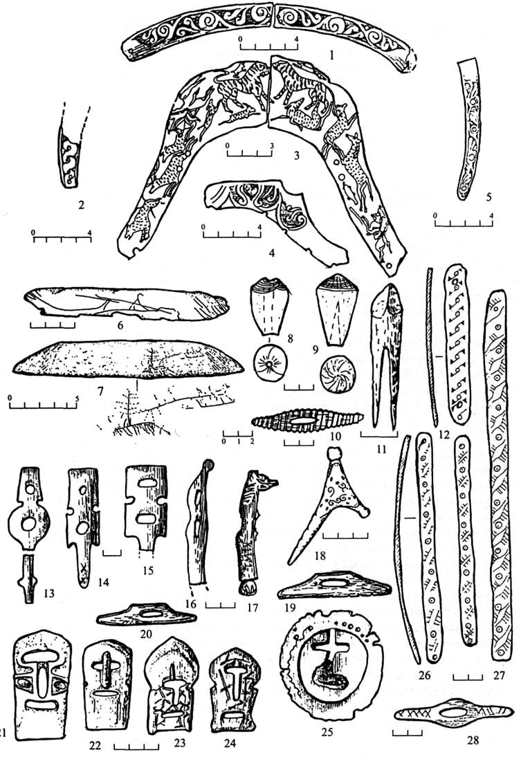 Не менее символичны амулеты в форме когтя медведя или зуба животного (рис. 2, 2). Издревле зуб жеребёнка подвешивали на грудь ребёнку, который якобы предохранял его от зубной боли [Петере, 1986, с. 35]. Орнаментированная подвеска (рис. 2, 3), вероятно, просто трансформировалась из такого амулета и стала украшением, что свидетельствует об эволюции костореза.