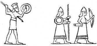По одежде и вооружению урарты отличались от ассирийцев и ближе всего стояли к хеттам, для которых шлем с гребнем, копьё и небольшой круглый щит были также характерны (рис. 7). [4]