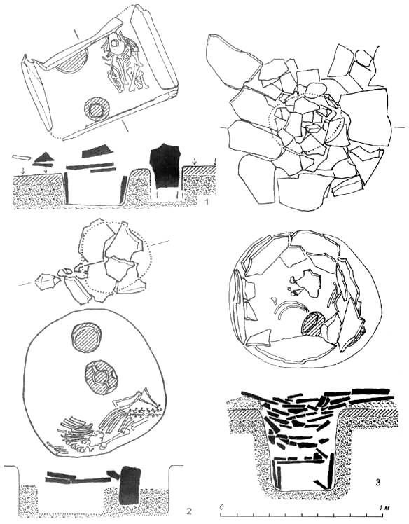 Рис. 2. Могильник Быстрая II: 1-2 — «помины»; 3 — частичное захоронение.