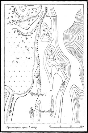 Всех могил в могильнике около сорока, причём из них раскопана двадцать одна могила (на плане помечены крестиком) 1. [сноска: 1 Коллекция из раскопок могильника Кудыргэ зарегистрирована в Этнографическом Отделе Русского музея под № 4150 и 4389.] По внешнему виду каждая могила легко различима. Овал (1,4x2,4 м.) из расположенных один возле другого крупных камней, или овал расплывчатого очертания из камней, выступающих над поверхностью почвы сантиметров на тридцать, обозначает могилу (рис. 3, слева). Направление продольной оси могилы совпадает с направлением песчаной гривы, на которой могилы расположены, и направлением русла реки N-S. По снятии каменной кладки овала и камней, заполняющих внутренность могилы, на глубине примерно 30-40 см., каменные глыбы исчезают, и внутри могилы мы находим только песок. Ниже, на глубине около 1,3 м., снова появляется слой каменных глыб во всю площадь могилы, под которым обнаруживается скелет лошади, а несколько глубже (см. на 20-25) параллельно ему расположенный скелет человека на спине, с руками, вытянутыми вдоль туловища или сложенными на лобке (рис. 3, справа). Погребённый обычно обращен головой на S (15 случаев) реже на N (6 случаев). Лошадь, как правило, лежит с поджатыми ногами, спиною кверху, туловищем слегка наклоненным на левый бок, с вытянутой вперед головою, которая, как и у погребённого, направлена на S, реже на N. Скелет лошади в могиле расположен несколько выше скелета человека. Получается такое впечатление, будто бы приготовленная для погребения могила была ступенчатая. На дне могилы полагали труп умершего, а рядом с ним к востоку и параллельно ему, на уступе, возвышающемся см. на 20 над дном могилы клали труп лошади. Быть может после положения трупа человека на дне могилы, его засыпали песком и затем уже клали труп лошади. Вследствие того, что грунт, в котором заключаются погребения, песчаный и песком же засыпалась могила, почти невозможно установить точной границы грунта копанного и некопанного. Умершие обычно клались на дно могилы без подстилки, но имеются два случая положения в гробу. В одном случае гробом служил ящик (0,65х2 м.) из тёса лиственничного дерева (около 4 см. толщиною),
