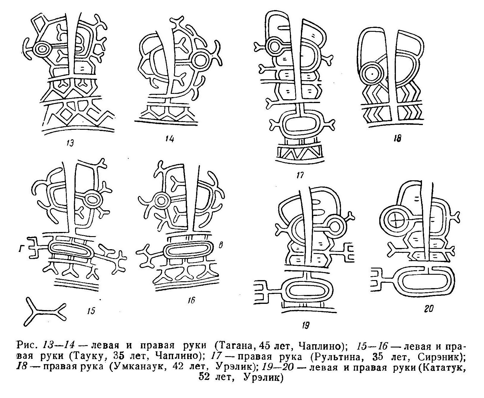 Рис. 13-14 — левая и правая руки (Тагана, 45 лет, Чаплино); 15-16 — левая и правая руки (Тауку, 35 лет, Чаплино); 17 — правая рука (Рультина, 35 лет, Сирэник); 18 — правая рука (Умканаук, 42 лет, Урэлик); 19-20 — левая и правая руки (Кататук, 52 лет, Урэлик).