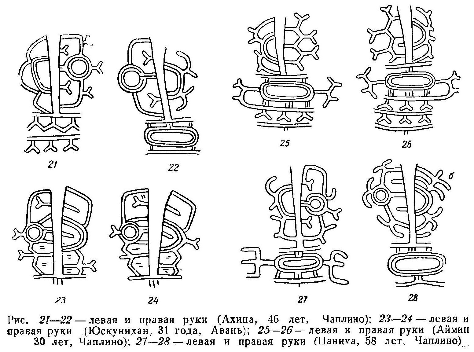 Рис. 21-22 — левая и правая руки (Ахина, 46 лет, Чаплино); 23-24 — левая и правая руки (Юскунихан, 31 года, Авань); 25-26 — левая и правая руки (Аймин 30 лет, Чаплино); 27-28 — левая и правая руки (Паннуа, 58 лет, Чаплино).