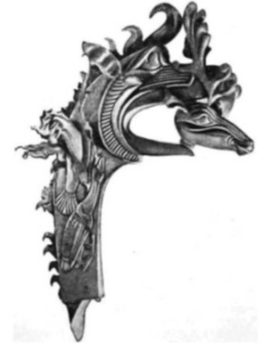 Особого внимания заслуживает найденная в колоде в её головной части очень сложная композиция особого ритуального или церемониального назначения (рис. 10). Из дерева вырезана чрезвычайно выразительная голова орлиного грифона. Гребень и уши у него кожаные. В клюве грифона голова оленя, вырезанная из одного с ним куска дерева. Рога и уши оленя кожаные. На шее грифона с обеих сторон одна и та же композиция: гусь в когтях грифона. Изображение гуся мастерски выполненное, барельефное. Туловище грифона и хвост исполнены барельефом,