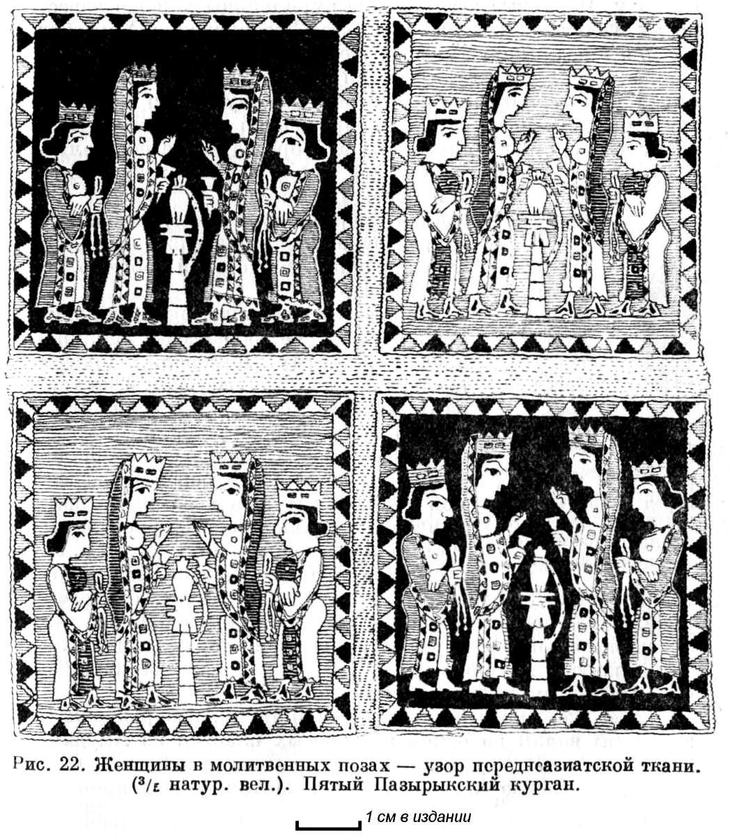 ![]() ^ Женщины в молитвенных позах — узор переднеазиатской ткани. Пятый Пазырыкский курган. — 65