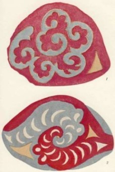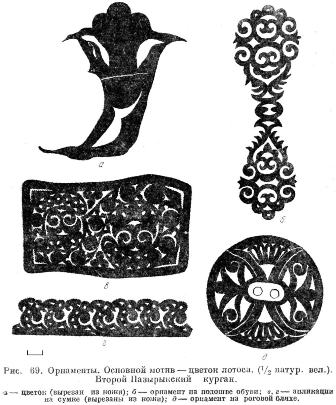 ![]() ^ Вырезанные из кожи украшения. Первый Пазырыкский курган. — 194
