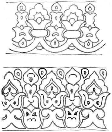 ![]() ^ Орнамент на женской обуви. Второй Пазырыкский курган. — 105