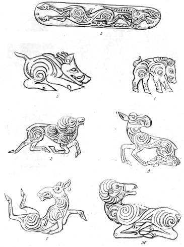 ![]() ^ Фантастическое животное. Котандинский курган. Голова козули в пасти волка и голова горного барана в пасти волка из первого и четвёртого Пазырыкских курганов. — 222