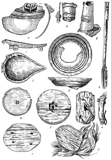Рис. 26. Различные предметы из курганов Ноин-Ула (1/3 нат.вел.).а — часть бронзового сосуда; б — ручка того же сосуда. Курган №25; в — горлышко бронзового сосуда. Курган №25; г — плоский бронзовый сосуд. Курган №1; д — плоская бронзовая чаша. Курган №1; е — деревянная ложечка. Курган №25; ж — бронзовая крышечка. Курган №25; з — донце деревянного сосуда. Курган №6; и — деревянная дощечка с отверстиями и ремешками. Курган №24; к — деревянное донце с отверстиями. Курган №6; л — то же с пучком конских волос. Курган №6.(Открыть Рис. 26 в новом окне) |