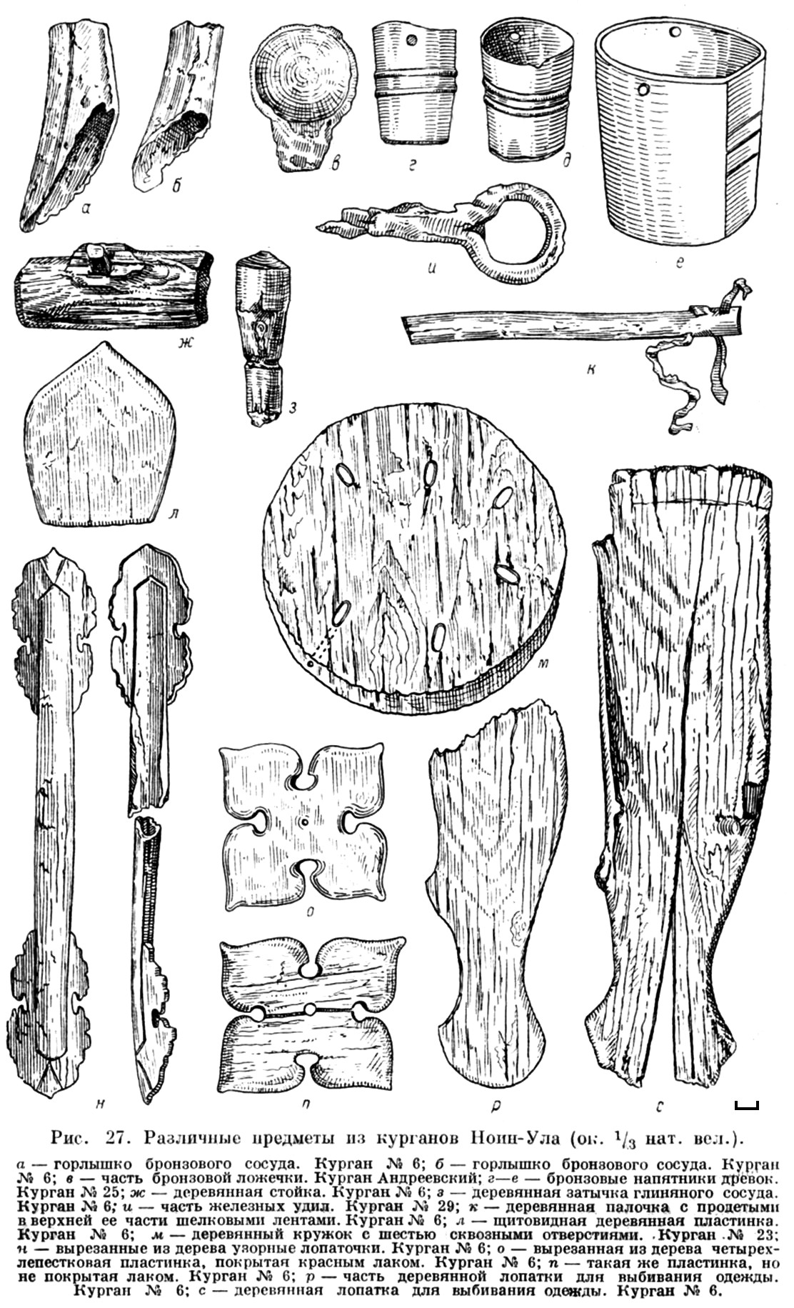 Рис. 27. Различные предметы из курганов Ноин-Ула (ок. 1/3 нат.вел.).а — горлышко бронзового сосуда. Курган №6; б — горлышко бронзового сосуда. Курган №6; в — часть бронзовой ложечки. Курган Андреевский; г-е — бронзовые напятники древок. Курган №25; ж — деревянная стойка. Курган №6; э — деревянная затычка глиняного сосуда. Курган №6; и — часть железных удил. Курган №29; к — деревянная палочка с продетыми в верхней её части шёлковыми лентами. Курган №6; л — щитовидная деревянная пластинка. Курган №6; м — деревянный кружок с шестью сквозными отверстиями. Курган №23; н — вырезанные из дерева узорные лопаточки. Курган №6; о — вырезанная из дерева четырёхлепестковая пластинка, покрытая красным лаком. Курган №6; п — такая же пластинка, но не покрытая лаком. Курган №6; р — часть деревянной лопатки для выбивания одежды. Курган №6; с — деревянная лопатка для выбивания одежды. Курган №6.(Открыть Рис. 27 в новом окне) |