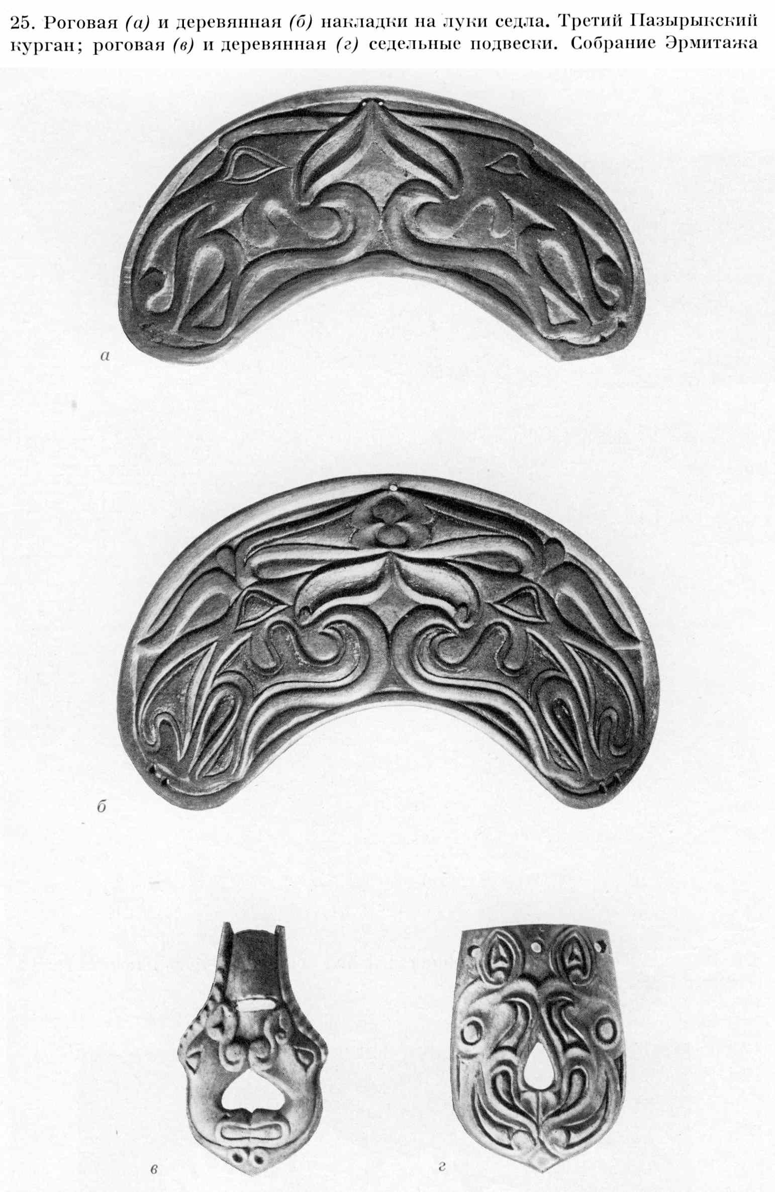 ![]() ^ 25. Роговая (а) и деревянная (б) накладки на луки седла. Третий Пазырыкский курган; роговая (в) и деревянная (г) седельные подвески. Собрание Эрмитажа.