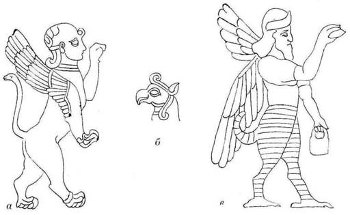 ![]() ^ 95. а — рогатые львиные головы. Ассирийский штандарт; б — рогатая львиная голова. Капитель дворца Ксеркса в Персеполе.
