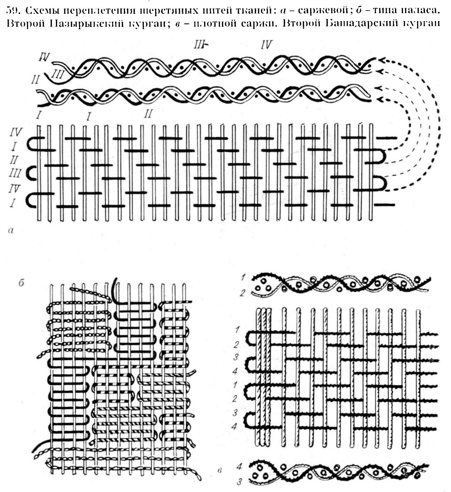 ![]() ^ 45. Схема переплетения нитей уточноворсовой ткани: а — поперечный разрез, б — грунтовый уток; в — ворсовый уток. Второй Башадарский курган.