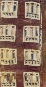 ![]() ^ 31. Ворсовый стриженый шерстяной ковёр. Пятый Пазырыкский курган.