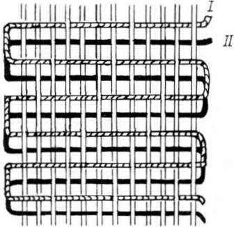 ![]() ^ 72. Схема переплетения нитей китайской шёлковой ткани с одной основой и двумя утками. Третий Пазырыкский курган.