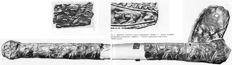![]() ^ 79. а — фрагмент золотого литого украшения. Зивийе; б — увеличенная деталь золотого нагрудника. Зивийе; в — золотое украшение ножен меча. Литой курган.