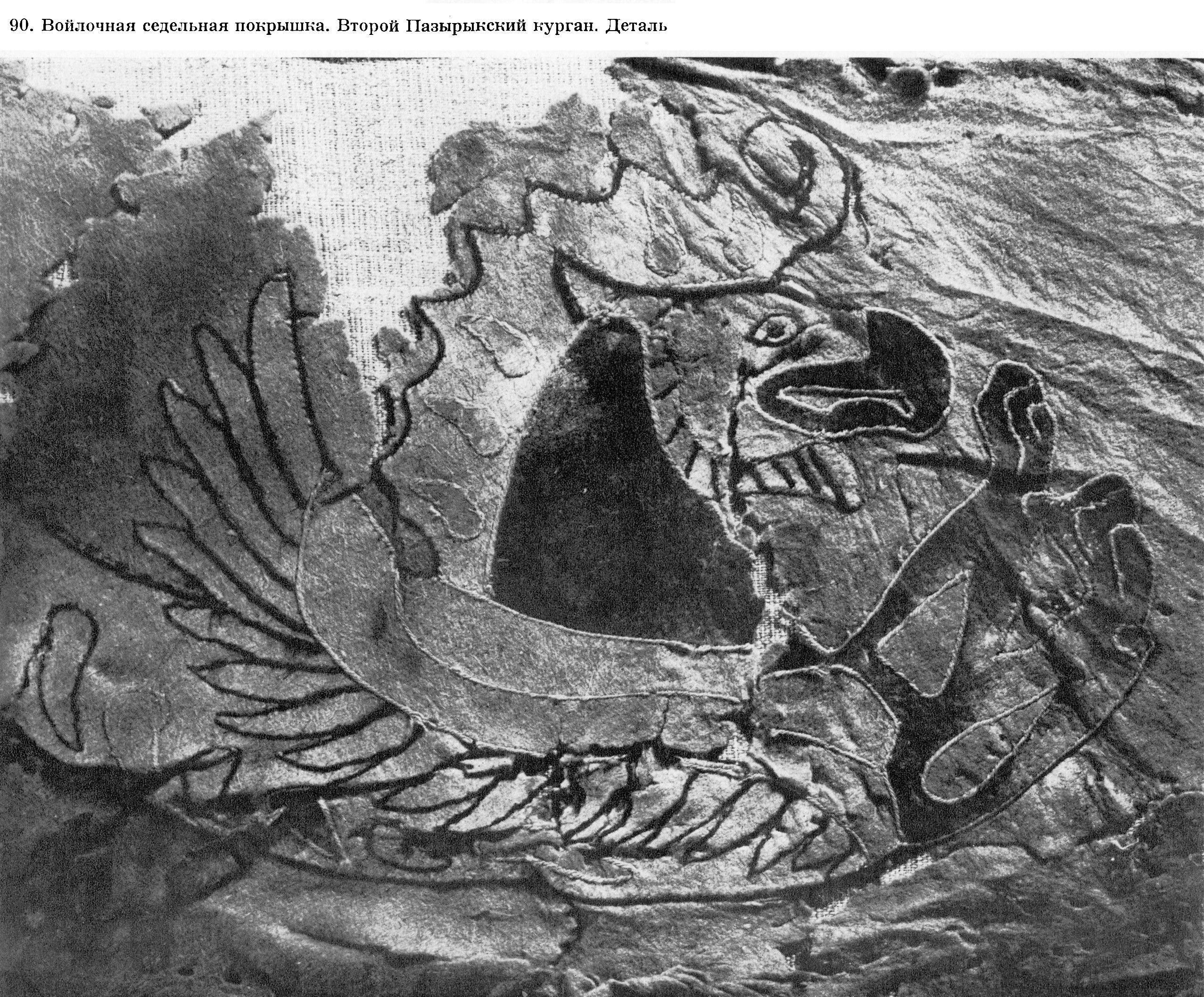 ![]() ^ 90. Войлочная седельная покрышка. Второй Пазырыкский курган. Деталь.