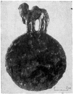 Другое зеркало также относится к типу медалевидных, но петля здесь оформлена в виде фигурки стоящего верблюда. Верблюд изображён в спокойной позе, показаны четыре ноги, слегка вислый зад, характерный изгиб высокой шеи, маленькая прямо поставленная голова и даже подшёрсток на шее (рис. 2). Обратная сторона фигурки гладкая, но на ней сохранились остатки обломанной, горизонтально расположенной петли. Изображения фигур стоящих