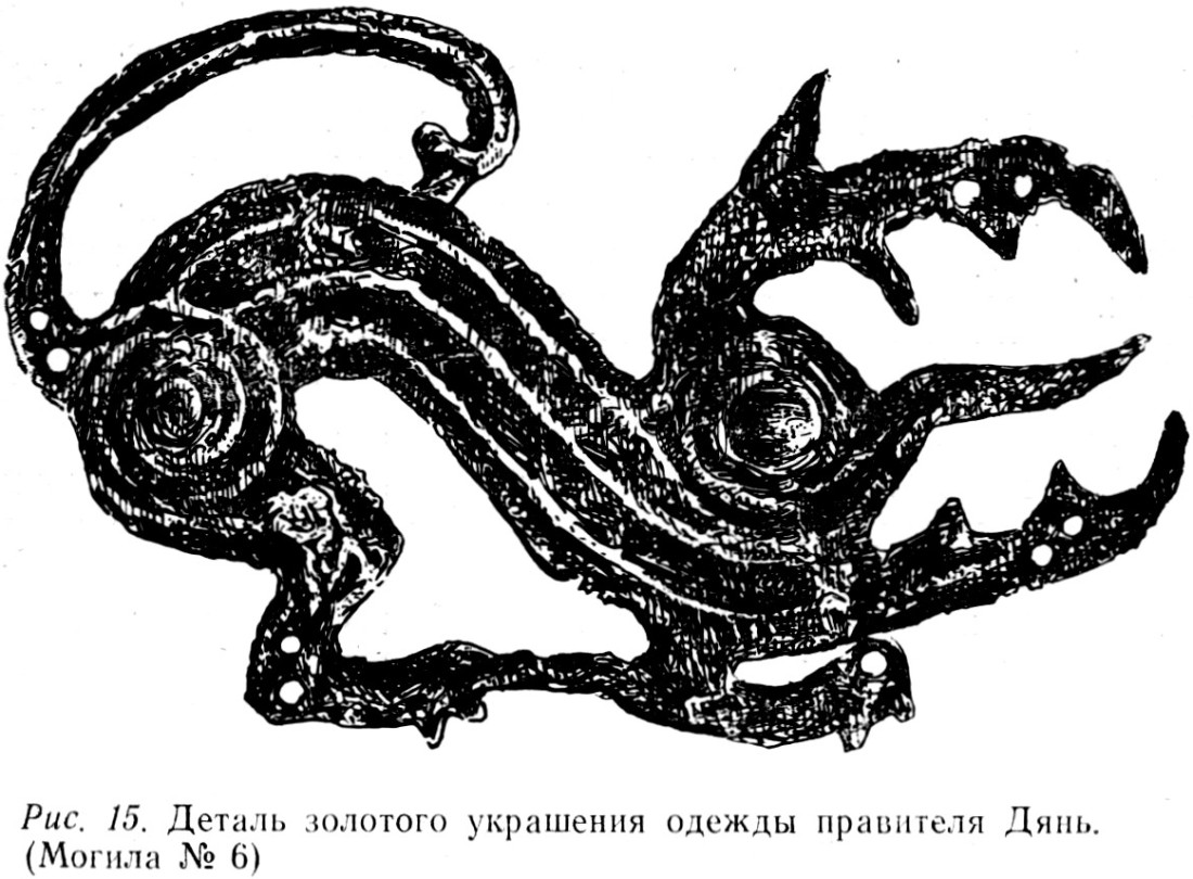 Наконец, удивительным образом геральдические изображения фантастических хищников проникают в юго-восточную Азию: в материалах могильника Шичжайшань (Китай, пров. Юньнань) имеются две золотые парные бляхи с несколько стилизованными в местной манере изображениями того же самого персонажа (рис. 2, 5); по Р.Ф. Итсу, «украшение костюма правителя царства Дянь» (Итс 1976: рис. 15). Могильник Шичжайшань относится к культуре Диен (или Дянь) и датируется IV-III вв. до н.э. По мнению Д.В. Деопика, формирование в этой культуре «“всаднического комплекса” (к которому относятся и данные находки. — Д.С.) — результат кратковременного, но сильного влияния извне, в том числе и со стороны центральноазиатских племён» (Деопик 1979: 67). По-видимому, это наиболее поздние изображения фантастического хищника, сохранившие свои иконографические особенности и в этом плане сопоставимые с исходными прототипами на печатях из Маргианы.