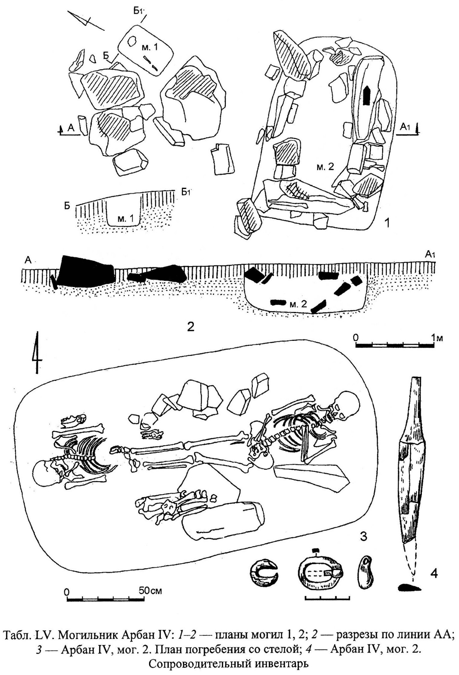 1-2 — планы могил 1, 2; 2 — разрезы по линии АА; 3 — Арбан IV, мог. 2. План погребения со стелой; 4 — Арбан IV, мог. 2. Сопроводительный инвентарь.