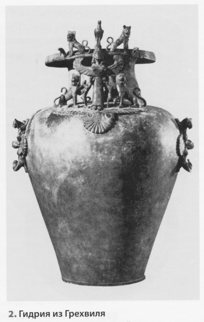 Правда, некоторые импорты, обнаруженные в ареале гальштатской культуры, относятся к довольно раннему времени. Так, ойнохои из Вильсингена и Каппеля датируются последней третью VII века до н.э. Гидрия из Грехвиля (кантон Берн, Швейцария) высотой 57 см, найденная в кургане с трупосожжением, была изготовлена в одной из греческих колоний в Италии в 580-570 годах до н.э. [16] Особенно замечательна её ручка в виде крылатой повелительницы зверей, окружённой четырьмя львами и увенчанной орлами и змеями (ил. 2). В руках богиня держит зайца, символ плодовитости. [17] Аналогичные сосуды найдены в Трейи и датируются 565-550 годами до н.э. (ил. 3). Гидрии из Грехвиля и Трейи можно рассматривать как результат эксперимента спартанских мастеров по бронзе, на которых оказали влияние резчики по слоновой кости и изготовители терракотовых рельефов для больших глиняных ваз. [18] Таким образом, вполне вероятно, что роскошные винные приборы экспортировались в варварские регионы не только из Массалии, но и из некоторых других регионов Великой Греции. Этрусские кубки, также встречающиеся в Средней Европе, были созданы в пределах VI века до н.э. или после 525 года до н.э. Фрагментарный характер археологических источников не позволяет говорить о значительном потоке импортных изделий в это время.