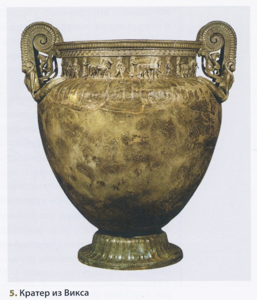 Аристократические погребения, как и резиденции нобилей, также часто содержали импорты средиземноморского происхождения. В большом кургане в Виксе (диаметр 42 м, высота 6 м), раскопанном в 1953 году поблизости от Монт-Лассуа, на кузове повозки покоилась тридцатипятилетняя женщина с золотой диадемой и множеством других украшений — браслетов, фибул, ожерелий из янтаря и т.п. Четыре колеса повозки были прислонены к восточной стене могилы. Этот транспорт использовался как похоронные дроги и является особенностью элитных погребений позднего гальштата. Вес диадемы, или торквеса, украшавшего голову усопшей, — 480 г, его окончания оформлены в виде львов, когтями сжимающих шары, и фланкированы крылатыми конями, выполненными в ориентализированном стиле (ил. 4). Диадема может быть произведением греко-этрусского искусства, но, поскольку ничего подобного в классическом мире неизвестно, она, по-видимому, была изготовлена на заказ с учётом «варварского» вкуса или действительно сделана местными мастерами. Две аттические чернофигурные чаши (обе датируются между 525 и 500 годом до н.э.), бронзовый кубок, две импортные бронзовые кастрюли и упомянутые выше привозные и местные украшения входили в сопроводительный инвентарь погребённой. Наиболее поразителен в данном комплексе бронзовый кратер — сосуд для вина, смешанного с водой, который попал в Массалию из Лаконии или Тарента, а уже оттуда — в курган в Виксе. Его высота превышает 1,6 м, весит он 208 кг (ил. 5). Верхняя часть кратера декорирована фризом с изображениями пехотинцев и колесниц, запряжённых четвёркой лошадей (ил. 6), ручки заканчиваются петлями в виде головы Медузы. Крышка кратера украшена женской фигурой. [19]