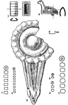 1-5 — бусы; 7 — обойма-накосник; 8 — пронизь; 9 — эполетообразная застёжка. 1-3 — камень; 4, 5 — стекло; 7-9 — бронза.