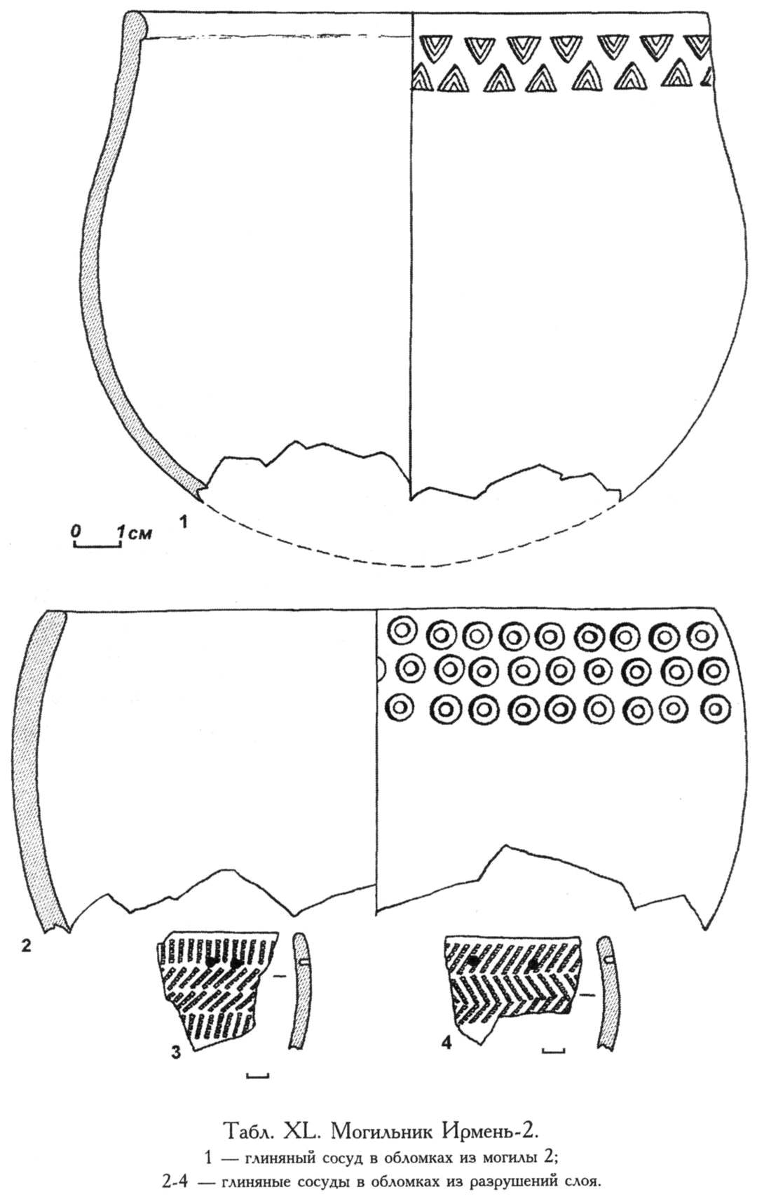 ^ Табл. XCIX. Могильник Бедарево-2. Могила 1 (А) и обломки глиняных сосудов из культурного слоя (1-3).