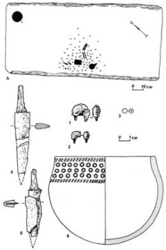1 — роговой гарпун; 2 — костяной наконечник стрелы; 3 — роговой блок; 4 — накладка; 5 — нож; 6 — глиняный сосуд. 4, 5 — железо.