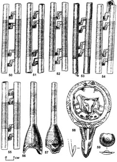 50-57 — пронизи; 58 — эполетообразная застёжка; 59 — накладка. Всё бронза.