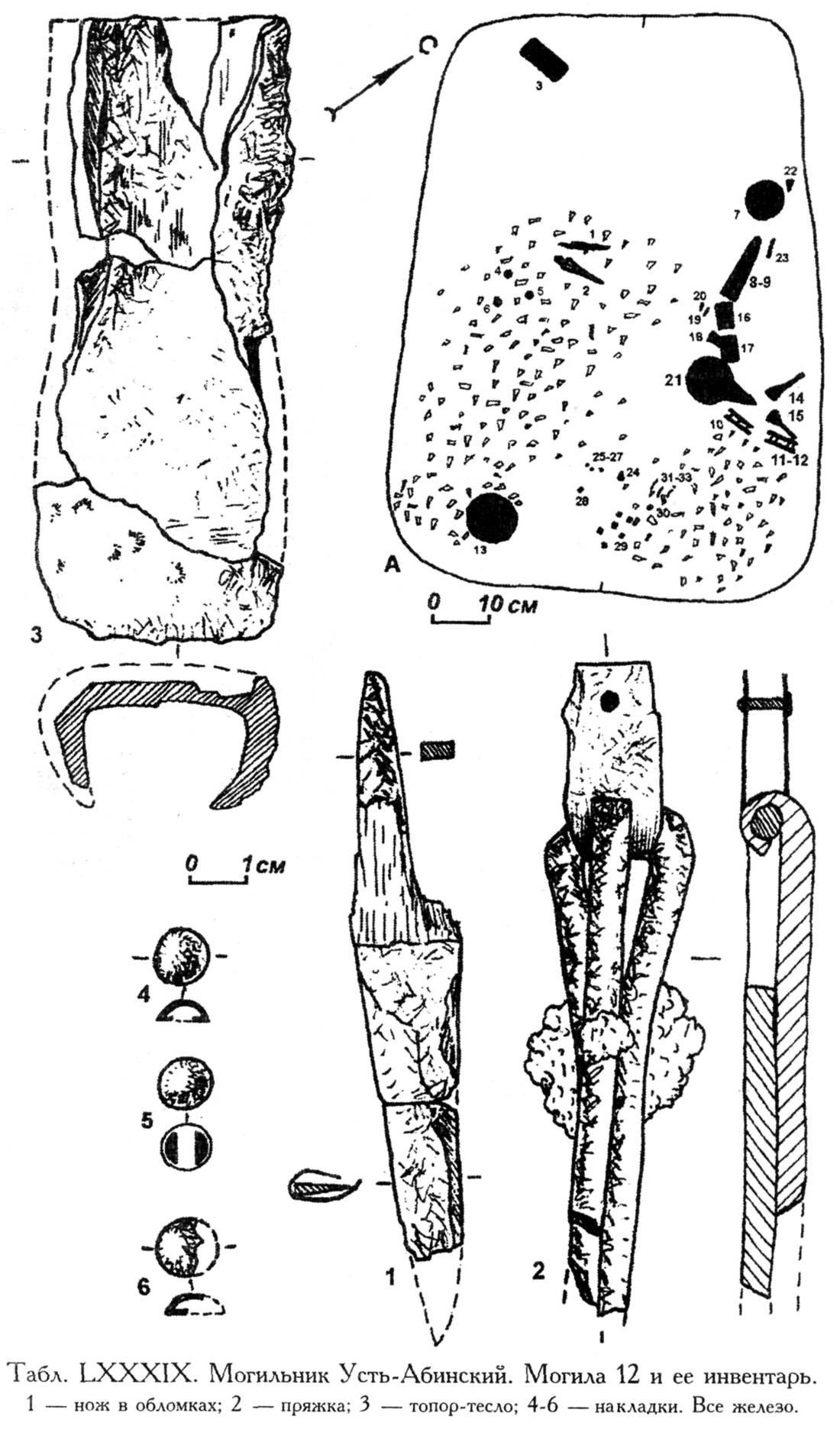 1 — нож в обломках; 2 — пряжка; 3 — топор-тесло; 4-6 — накладки. Всё железо.