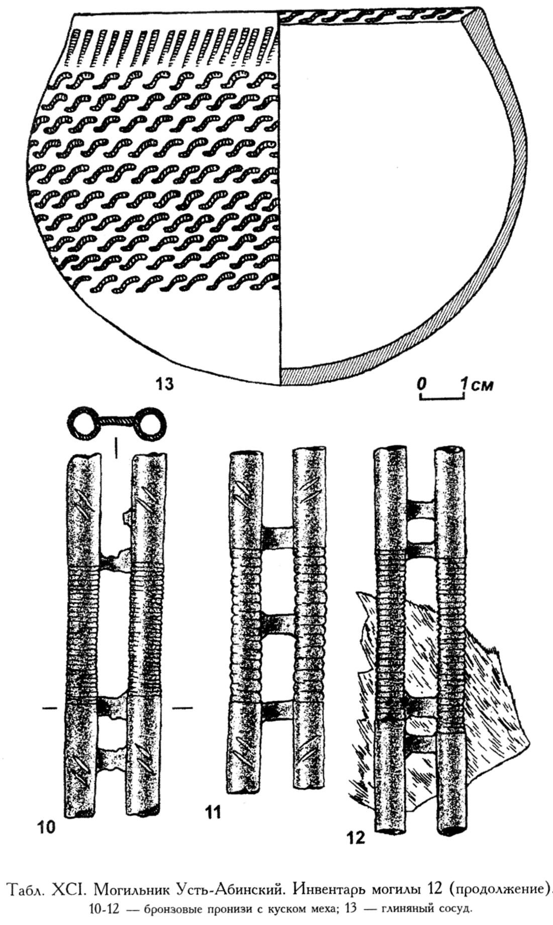 10-12 — бронзовые пронизи с куском меха; 13 — глиняный сосуд.
