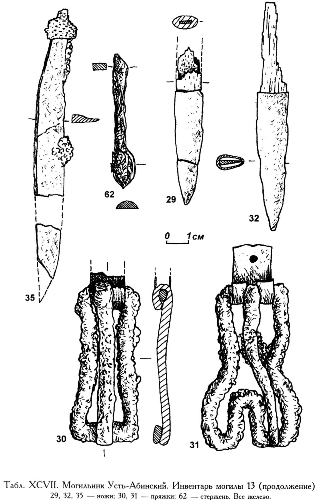 29, 32, 35 — ножи; 30, 31 — пряжки; 62 — стержень. Всё железо.