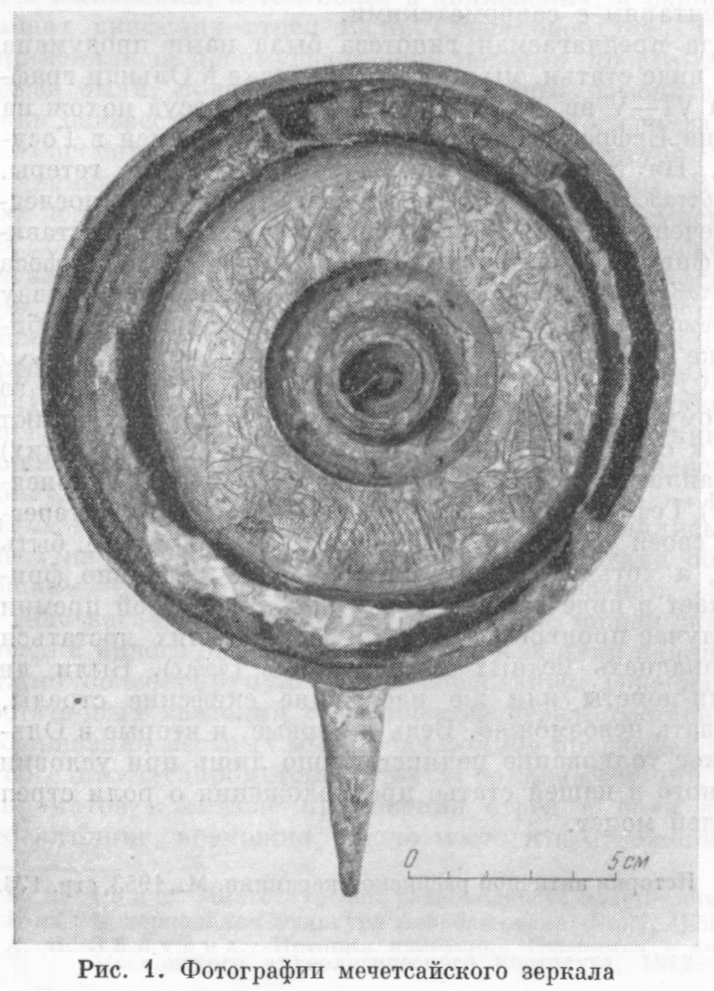 Религиозная сцена на мечетсайском зеркале вряд ли сарматского происхождения. Её выгравировал, вероятно, тот же мастер, который изготовил само зеркало в какой-то стране Древнего Востока. Поиски аналогий приводят нас в древние иранские области, в частности в Луристан. Близкая по композиции, стилю, и, вероятно, содержанию сцена изображена на диске бронзовой «булавки» из Луристана (рис. 3). [5]