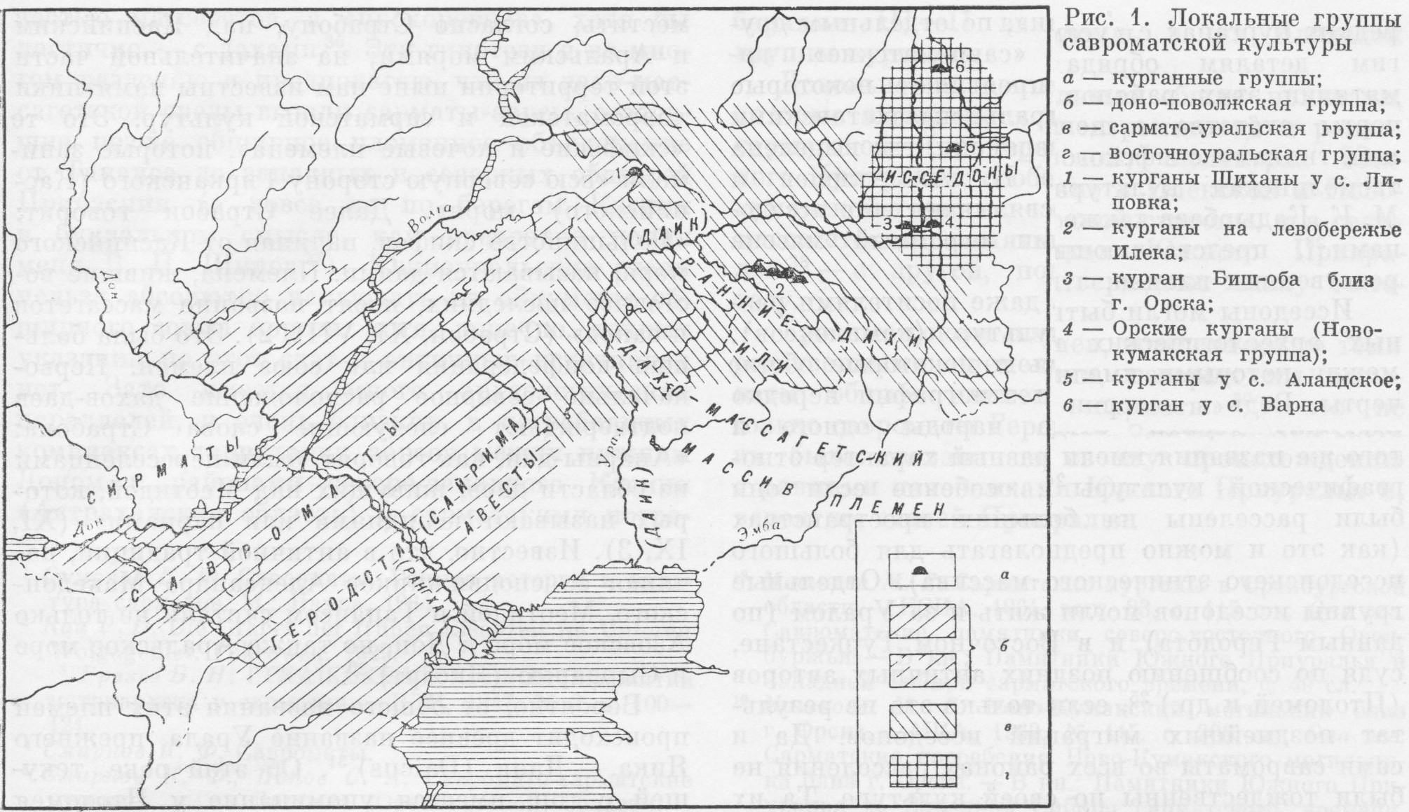 Западный вариант савроматской культуры — доно-поволжский — безусловно был связан с собственно совроматами [савроматами] Геродота, выделившимися из скифского массива племён Приазовья и расселившимися на «15 дней пути к северу» (Геродот, IV, 21). Эта идентификация, установленная ещё П.Д. Pay, [2] была принята вскоре Б.Н. Граковым [3] и затем мною. [4] В настоящее время она не вызывает никакого сомнения у всех исследователей. Не вполне ясно лишь, как далеко в заволжских степях расселялись геродотовские савроматы.