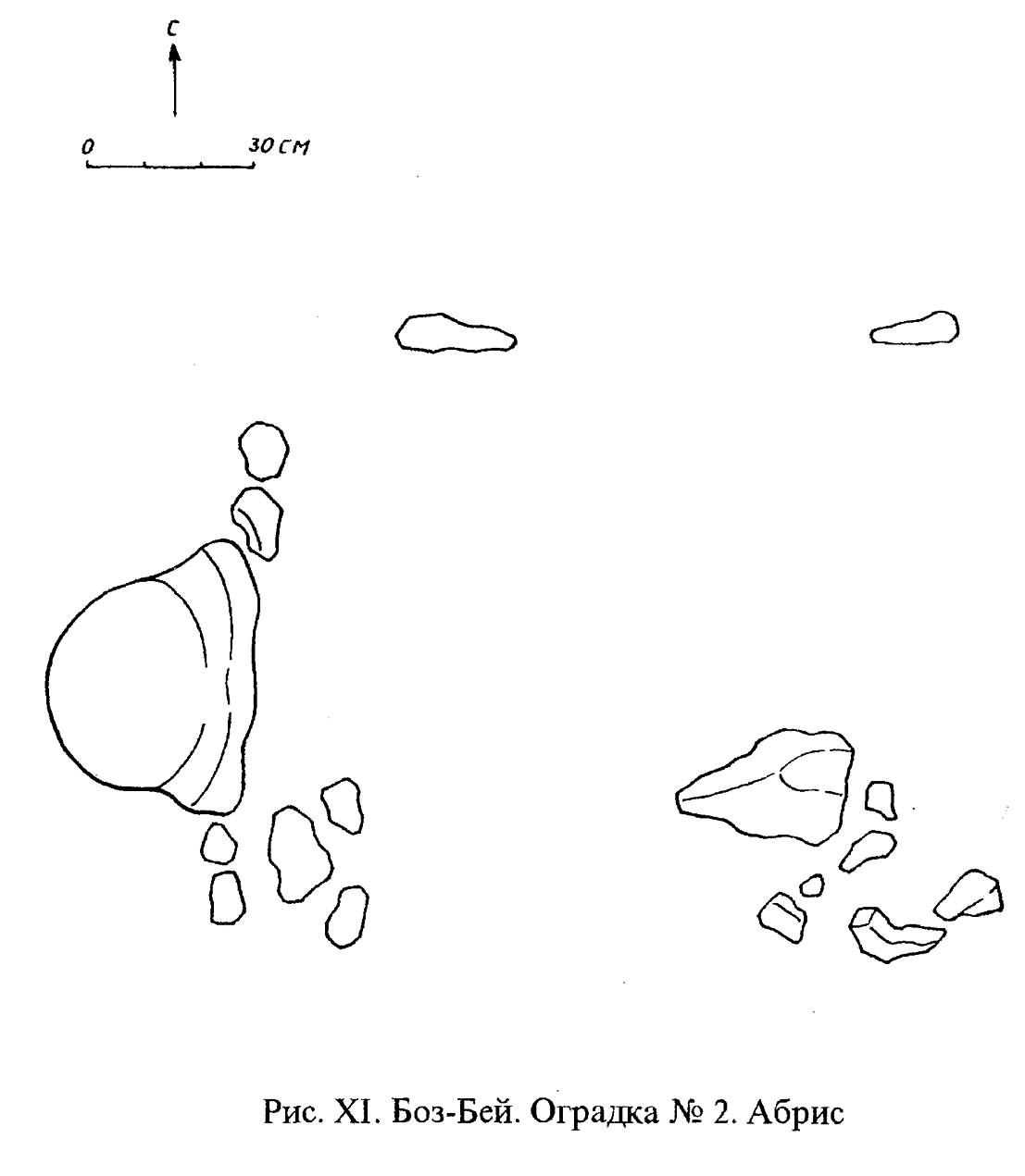 После снятия дёрна и зачистки выявлены очертания сооружения в виде несомкнутой квадратной оградки из вертикально врытых, специально подобранных плоских валунов. Площадь оградки забутована валунами (рис. V).