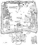 по 20 см), положенные на расстоянии 2,5 м одна от другой перпендикулярно к брёвнам пола (см. рис. 54). Потолок сохранился значительно хуже — брёвна прогнулись, посередине опустились до пола, значительная их часть полностью сгорела. Можно, однако, видеть, что потолок был настлан из брёвен диаметром 20-25 см, уложенных параллельно брёвнам пола.