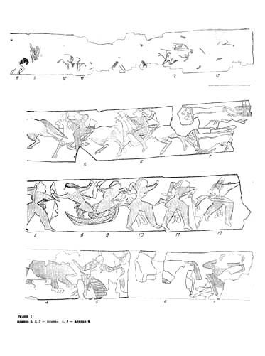 Совершенно новым явилось открытие в этом склепе обугленных планок с сохранившимися на них многофигурными рисунками. Планки, длиной до 1 м, шириной 6-12 см, с рукояткой на одном конце, покрывали едва заметные тонкие рисунки, вырезанные остриём ножа. На одной стороне планки обычно изображались бегущие олени, лоси, медведь, волк и другие звери, на другой — батальные сцены — композиции на темы героического эпоса и исторических повестей. Обнаружена планка, на одной стороне которой вырезаны батальные сцены, на другой — мчащиеся всадники-воины. На единственной трёхгранной планке каждая грань покрыта рисунками одного из трёх указанных сюжетов — бег зверей, мчащиеся всадники и батальные сцены. В целом же все сюжеты посвящены военным и военно-охотничьим темам. На планках изображены всадники и пешие воины с луком и стрелами, иногда в боевых доспехах. Они бегут, стреляют, мчатся на конях, падают — убитые н раненые. Показаны также картины битвы, угона военной добычи, погони, сражения на лодке и другие, большей частью пока нами не понятые. Сохранившиеся на планках рисунки, несомненно, представляют собой лишь контуры бывших здесь полихромных изображений. Это древнейшие в Азии миниатюры (III-IV вв. н.э.), стилистически совершенно своеобразные. Они оставлены обществом, не имевшим ещё ни государственности, ни письменности, в то время как все известные нам древние миниатюры и стенные росписи на героические темы создавались в государствах с классовым обществом, с развитой письменностью и литературой.