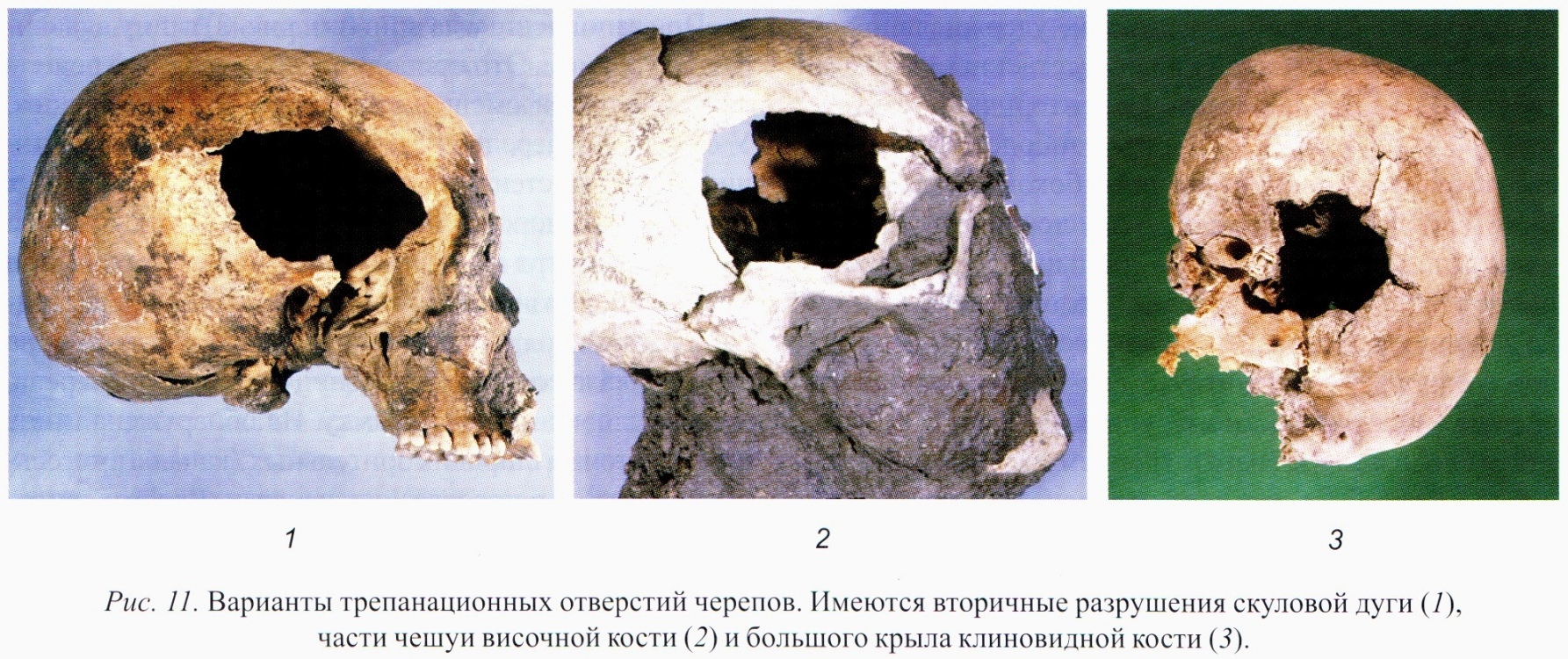 Рис. 11. Варианты трепанационных отверстий черепов. Имеются вторичные разрушения скуловой дуги (1), части чешуи височной кости (2) и большого крыла клиновидной кости (3).(Открыть Рис. 11 в новом окне) |