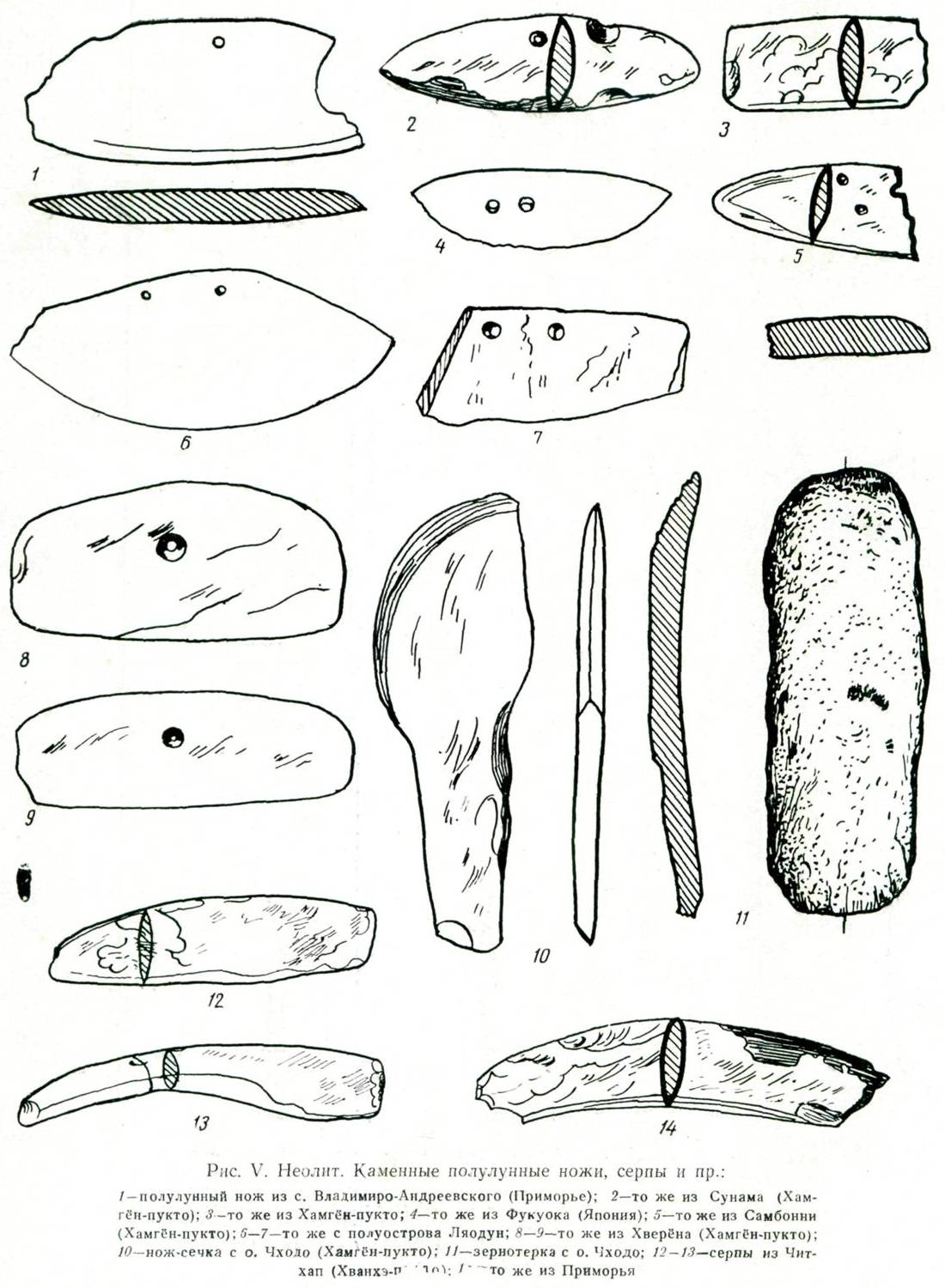 Рис. V. Неолит. Каменные полулунные ножи, серпы и пр. («Начжин...», 1957; То Ю Хо и Хван Ги Док, 1957; Хван Ги Док, 1957; Окладников, 1956; Leroi-Gourhan, 1946; Torii, 1915).
