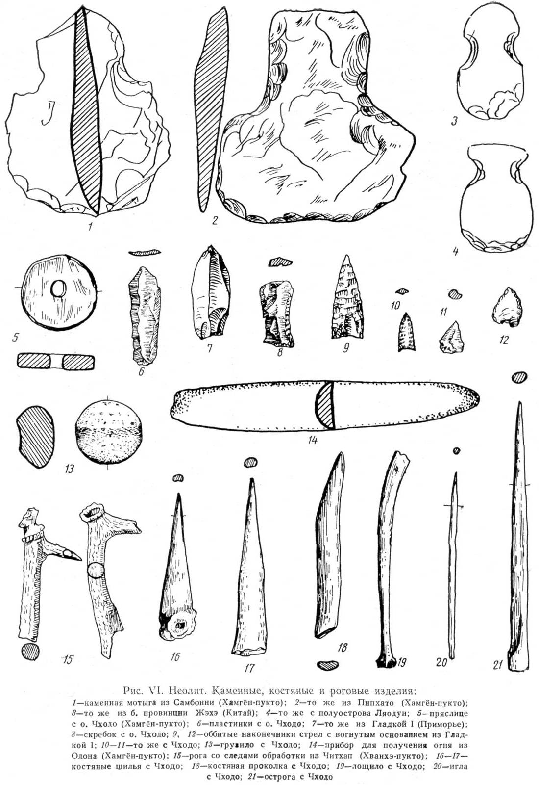 Рис. VI. Неолит. Каменные, костяные и роговые изделия (Окладников, 1958; «Начжин...», 1957; То Ю Хо и Хван Ги Док, 1957; Хван Ги Док, 1957, 1957а; Leroi-Gourhan, 1946).