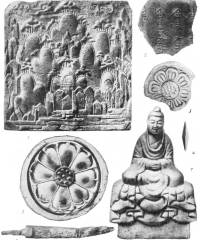 1 — золотая статуэтка Будды из храма Хванпок у г. Кёнчжу (Кёнсан-пукто); 2 — трёхэтажная пагода храма Хванпок (реконструкция); 3-5 — фронтальная черепица из района г. Кёнчжу; 6 — план погребальной камеры в «Супружеском кургане» (Пубучхон) близ г. Янсана (Кёнсан-намдо).