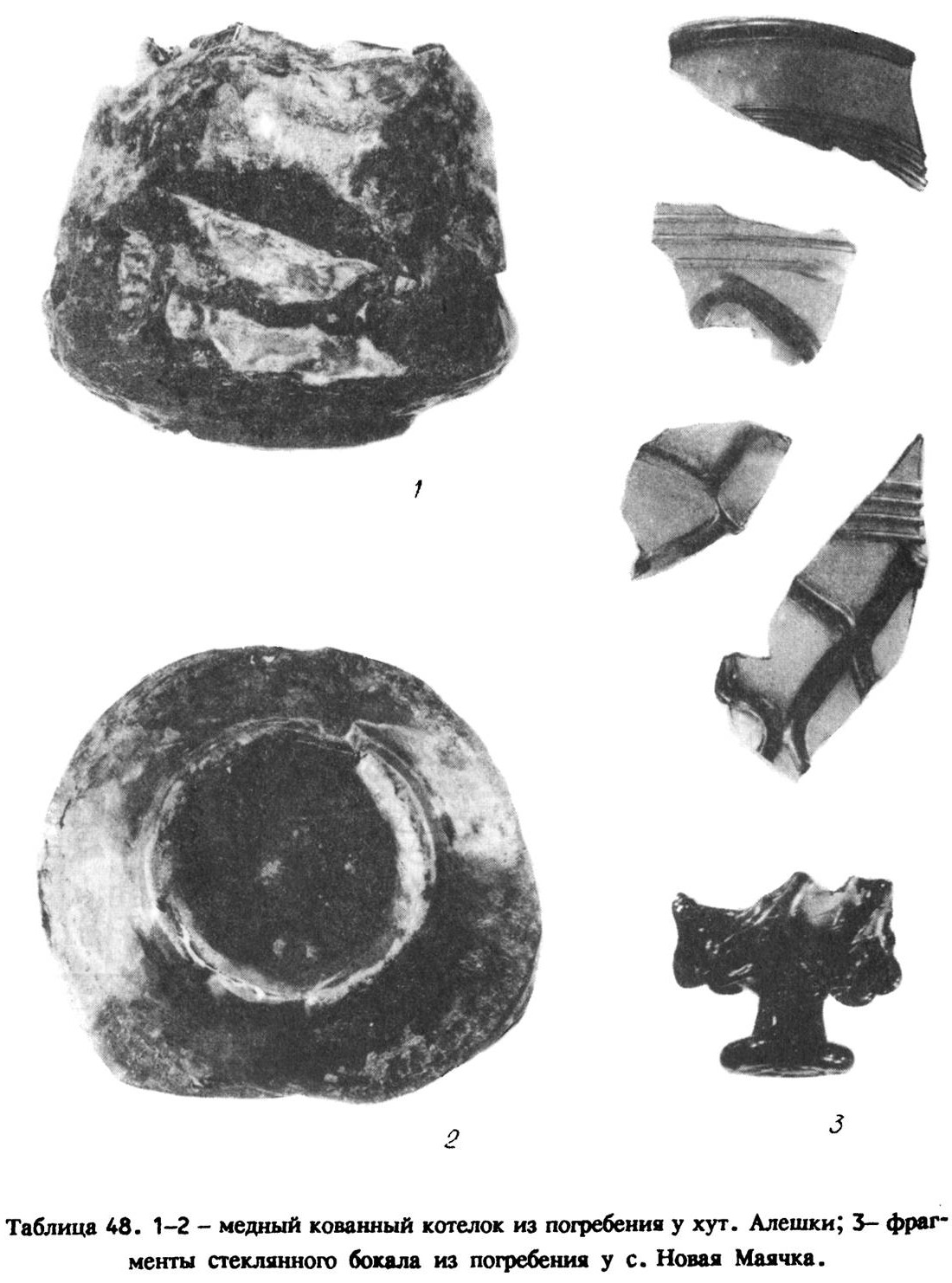 ^   Таблица 48. 1-2 — медный кованный котелок из погребения у хут. Алёшки; 3 — фрагменты стеклянного бокала из погребения у с. Новая Маячка.