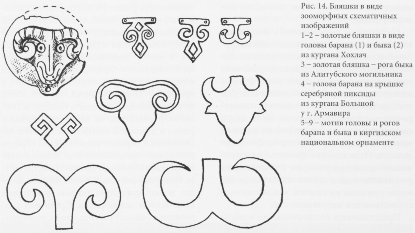 Трансформация рогов в орнаментальные элементы неоднократно встречается и в изделиях алтайского искусства ранних кочевников. В основе таких изображений лежит древнейший художественный приём — замена целого частью, когда изображение головы животного или только рогов, клюва и даже одного когтя символизировало образ в целом. При этом мастер воспроизводил лишь видовые признаки животных, по которым они могли быть безошибочно узнаваемыми. Аналогичное явление можно наблюдать и на сарматских бляшках. Так, например, «якоревидные» бляшки из кургана Хохлач по аналогии с орнаментальными мотивами на киргизских коврах можно отождествить, в одном случае, с головами барана, для которых видовым признаком являются рога, загнутые внутрь, а в другом — с головой быка с рогами в виде двух завитков, загнутых кверху (кат. 33-34, рис. 14).